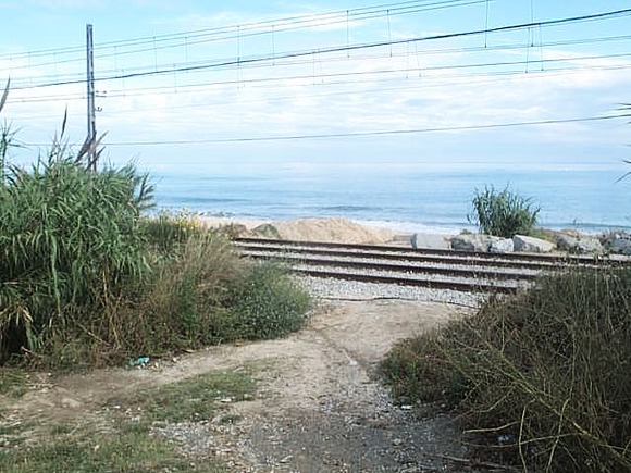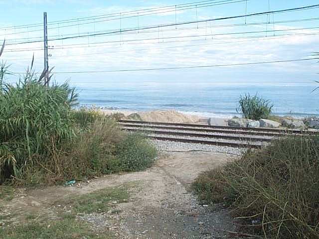 Man mußte über eine Bahnstrecke steigen, um an den Strand zu kommen. In Spanien sind die Bahnlinien genau zwischen den Straßen und dem Strand, was vielerorts zu Tunneln und Brücken führt, damit die Leute an den Strand kommen können. Oder, man geht einfach so über die Gleise, was aber sehr gefährlich ist. Denn, wenn man den Zug hört, ist es eigentlich schon zu spät.